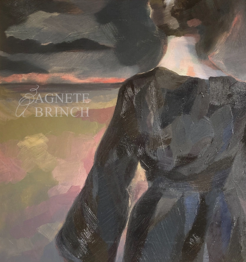 Den rygvendte kvinde er på vej, men mod hvad? Hun er tavs. Måske hun er ”den talende tavshed”, som et ubeskrevet blad i en bog – oplagt til refleksion og efterrationalisering. Hun symboliserer for mig en fremtid, hvor kvinder er og ses med deres forskellige styrker.